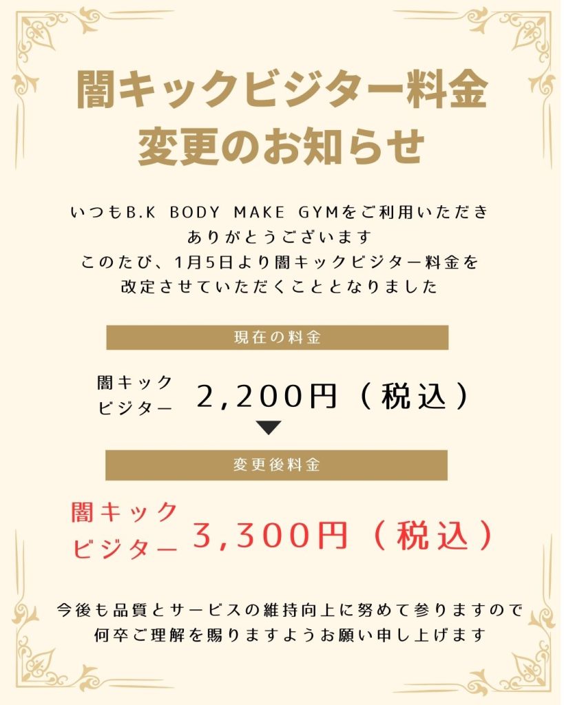 Uncategorized 闇キックビジター料金変更のお知らせ admin 2025年12月4日 0 14 Views 0 Likes いつもB.K BODY MAKE GYMをご利用いただきありがとうございます。 このたび、1月5日より闇キックビジター料金を改定させていただく事になりました。 今後も品質とサービスの維持向上に努めて参りますので何卒ご理解を賜りますようお願い申し上げます。 Share: